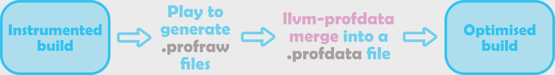 Improve CPU times with ONE WEIRD TRICK!! Instrumented PGO is a multi-stage process. Playing with instrumentation accrues raw telemetry data in a directory of .profraw files. Running command llvm-profdata merge --output=<filename>.profdata *.profraw within this directory will then package these into a single .profdata profile, to pass back to the compiler for the upcoming optimised build.