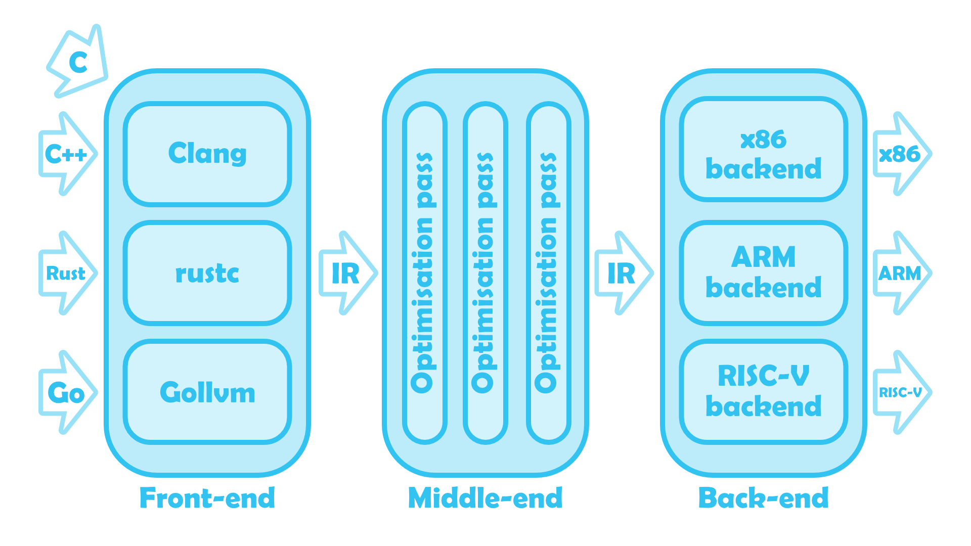 If you’re unfamiliar, modern compiler architecture consists of three main components. First, there is the front-end that interfaces directly with source code in whatever language it’s written it. LLVM parses C/C++ with Clang, for instance, Rust with rustc, Go with Gollvm, and so on. The front-end is the only part of the pipeline that isn’t language-agnostic: its sole purpose is translating your work to read more like assembly, standardising any of the its supported languages into one intermediate representation (IR) the rest of the toolchain can understand.