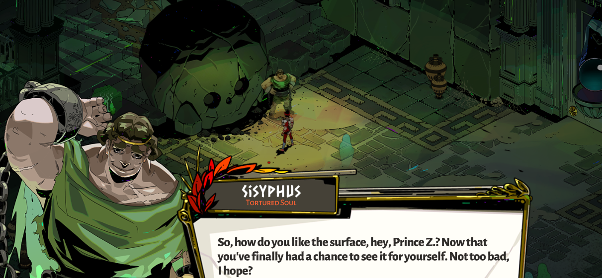 Early on in the roguelike Hades, you’ll likely run into Supergiant’s take on Sisyphus: a cheery chap with an even cheerier boulder (just look at that big fella’s winning smile!). You’ll just as likely pick up on the allusion to that old philosophical question, is Sisyphus happy? More than cheap reference humour, this is the game taking its genre conventions and using them to gently poke fun at you, the player. After all, how could any roguelike not characterise Sisyphus like this? If there was no meaning to be found in a repetitive and unending task - you wouldn’t be playing, would you? The worst thing one can to a joke is over-explain it, but I do want to tie in to the philosophy of humour here. For Schopenhauer, humour is “the suddenly perceived incongruity between a concept and the real”. Conceptually, that Sisyphus could be happy is absurd; in reality, you are; ergo: funny.